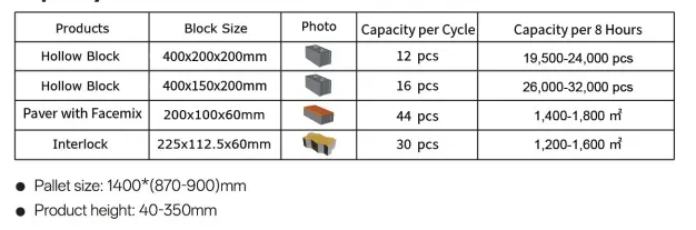 Zařízení vyrábí širokou škálu výrobků z dutých cihel, které pokrývají různé funkční typy, jako jsou běžné bloky, dekorativní bloky a izolační bloky. Tvary otvorů zahrnují čtvercové a kulaté otvory a uspořádáním lze dosáhnout jednořadých, dvouřadých a víceřadých struktur otvorů. Změnou formy nebo úpravou parametrů zařízení lze flexibilně střídat různé typy cihlářských výrobků tak, aby vyhovovaly různorodým požadavkům trhu.